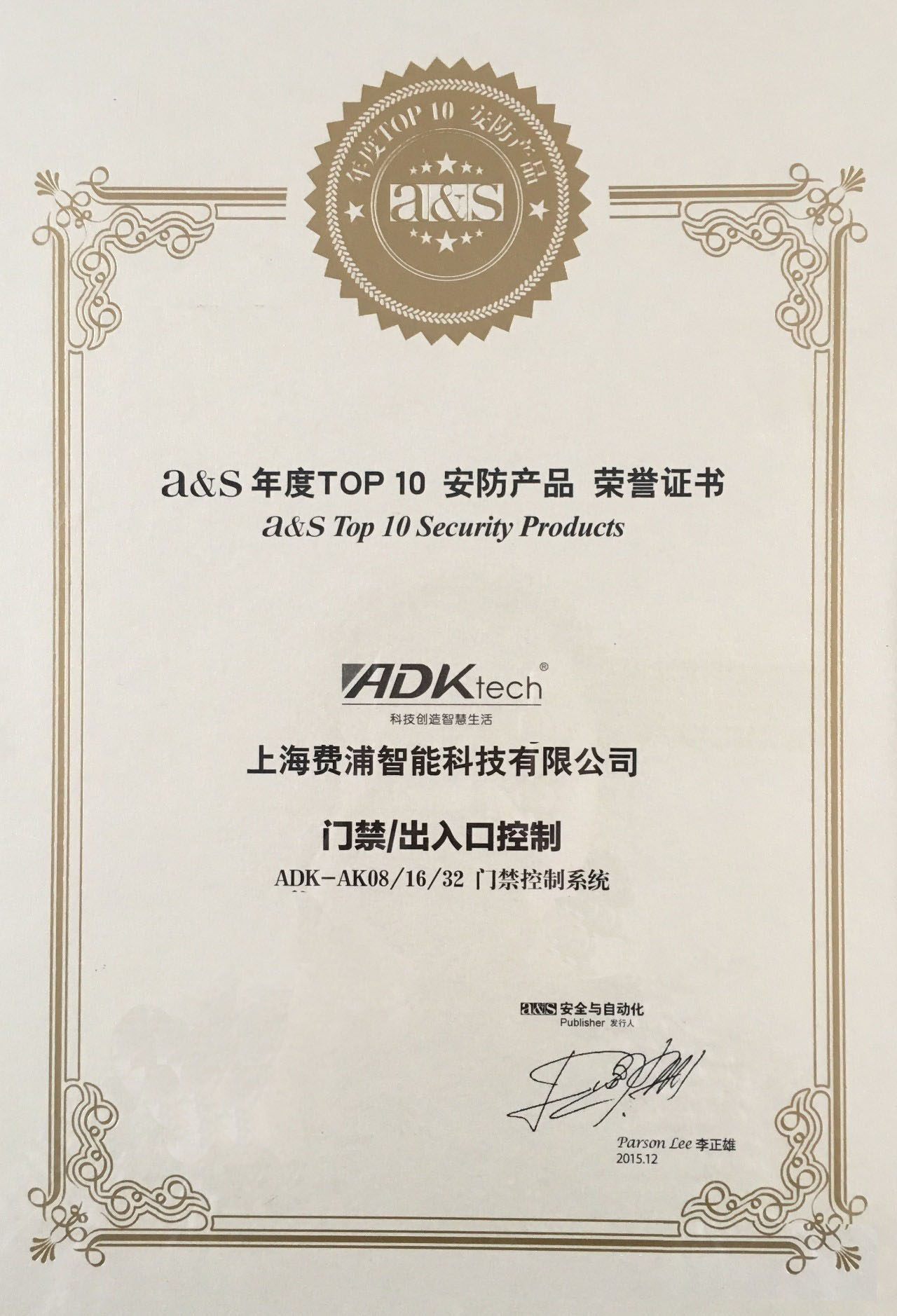 其中,上海费浦智能科技有限公司的门禁控制系统----(产品型号:ADK-AK08/16/32)在本次a&s 2015年度TOP 10最受欢迎安防产品----TOP10受欢迎门禁/出入口控制产品中脱颖而出。